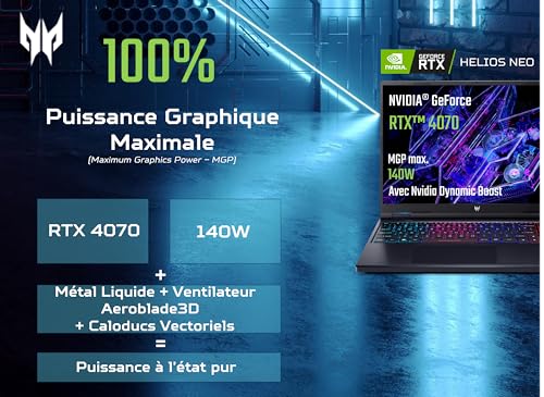 - GAMING D’ÉLITE : Dominez le jeu avec le laptop gaming Predator Helios équipé du processeur Intel Core i9-14900HX pour des performances de jeu décuplées, d’une graphique NVIDIA GeForce RTX 4070, 32 Go RAM DDR5 et 1 To PCIe NVMe SSD