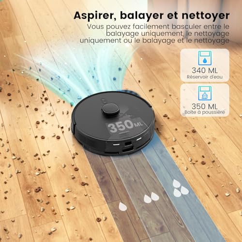 - 【Balayage, Nettoyage et Aspiration 3 en 1】L’robot aspirateur laveur AIRROBO T20+ dispose d’un bac à poussière 2 en 1 (340 ml) et d’un réservoir d’eau (350 ml). Cet aspirateur robot multifonction aux performances de qualité répondra à vos différents besoins pour les tâches ménagères quotidiennes, balayage, aspiration et serpillière, facilement à changer.