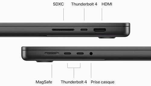 - CONNECTEZ CE QUE VOUS VOULEZ – Ce MacBook Pro offre un port de charge MagSafe, trois ports Thunderbolt 4, un lecteur de carte SDXC, un port HDMI et une prise casque. Et avec le Wi‑Fi 6E et le Bluetooth 5.3, vous profitez d’une connectivité sans fil parfaitement fluide. Et vous pouvez connecter jusqu’à deux écrans externes avec la M3 Pro et jusqu’à quatre avec la M3 Max. (Wi‑Fi 6E disponible dans les pays et les régions le prenant en charge.)