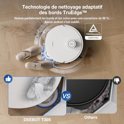 - 【TruEdge Adaptive Edge Mopping】Équipé de la technologie TruEdge, le DEEBOT T30S excelle dans le nettoyage des bords et des coins avec une précision inégalée. En utilisant un bras planant et des algorithmes avancés, il atteint une précision de 1 mm et améliore considérablement la couverture de 99 % dans les zones difficiles d’accès. Aucun endroit n’est épargné.