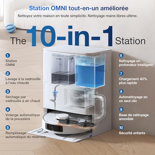 - 【Station OMNI tout-en-un améliorée】La station OMNI tout-en-un prend en charge le lavage de la vadrouille à l’eau chaude à 70 ℃, la vidange automatique, le remplissage automatique de l’eau et le séchage à l’air chaud. Cette station multifonctionnelle prépare votre DEEBOT T30S à tout défi de nettoyage, incarnant l’essence de la commodité et de la préparation.
