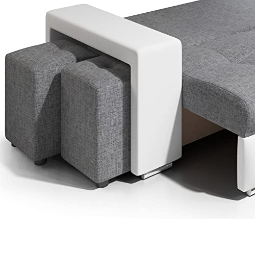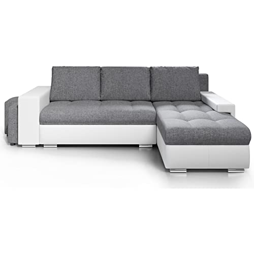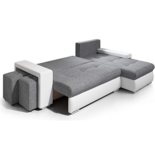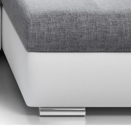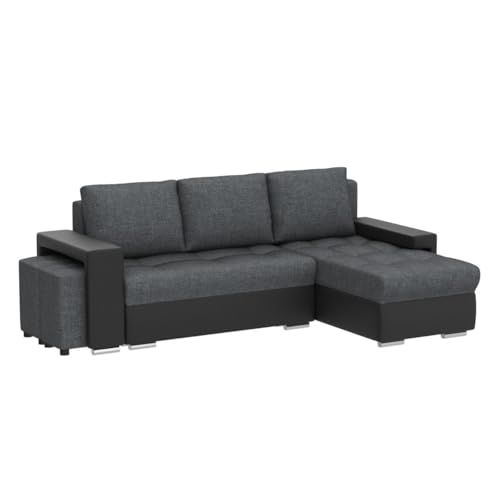 lestockdesign Canapé d’angle Simon 255 cm – Convertible et réversible avec Coffre – 3 Places – Simili Noir/Tissu Gris + 2 poufs