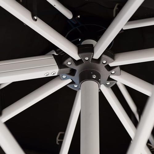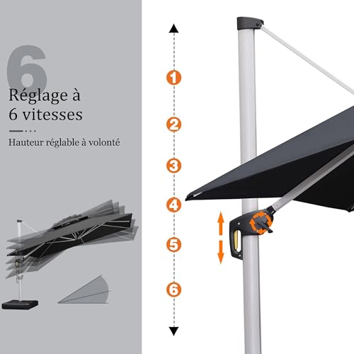 • Ce parasol déporté est doté d’une poignée unique et d’un système de manivelle avec 6 options de hauteur et d’angle et une rotation de 360 degrés pour un contrôle facile de la zone d’ombre