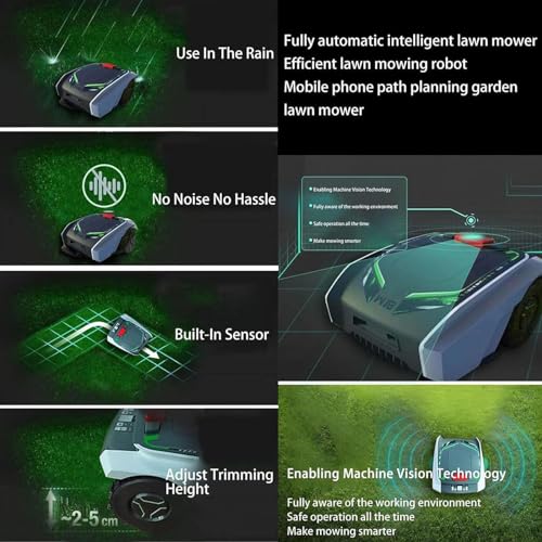 - 【MODES MULTIPLES】 Le robot tondeuse à gazon contrôle les roues via le logiciel intelligent intégré, tel que l’avant, l’arrière, le virage à gauche, le virage à droite et d’autres opérations de base, qui peuvent être automatiquement ajustées selon différentes méthodes de tonte.