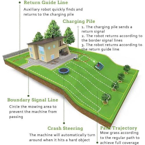 - 【SYSTÈMES INTELLIGENTS】 Les tondeuses à gazon robotisées peuvent détecter automatiquement l’herbe, la densité, contrôler la longueur du processus de coupe et estimer si le circuit est surchargé (la surcharge cessera automatiquement de fonctionner) ; lorsque la batterie est faible, elle reviendra automatiquement en mode de charge.