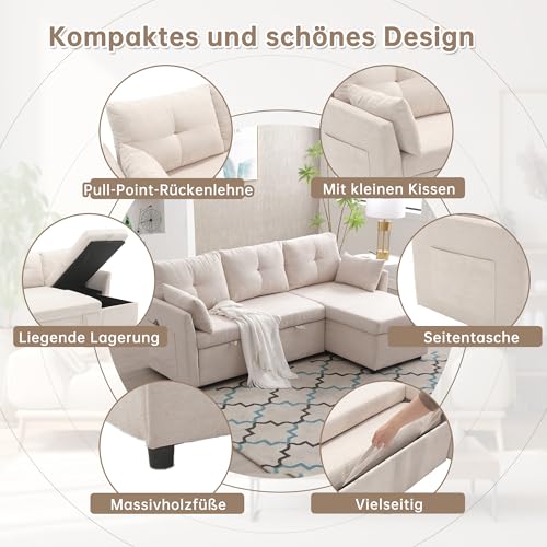 Sapgaks Canapé d’angle Convertible avec sièges de Rangement,canapé Convertible 3 Places avec Poches accoudoirs,canapé lit,Canapé modulaire en L (Beige)
