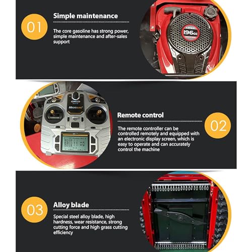 - SÉCURITÉ – La tondeuse peut être utilisée jusqu’à 200 mètres VIA la télécommande. Notre bielle hydraulique récemment améliorée la maintient stable lorsqu’elle tond sur une pente, augmentant encore davantage la sécurité sur des pentes raides allant jusqu’à 45 degrés.